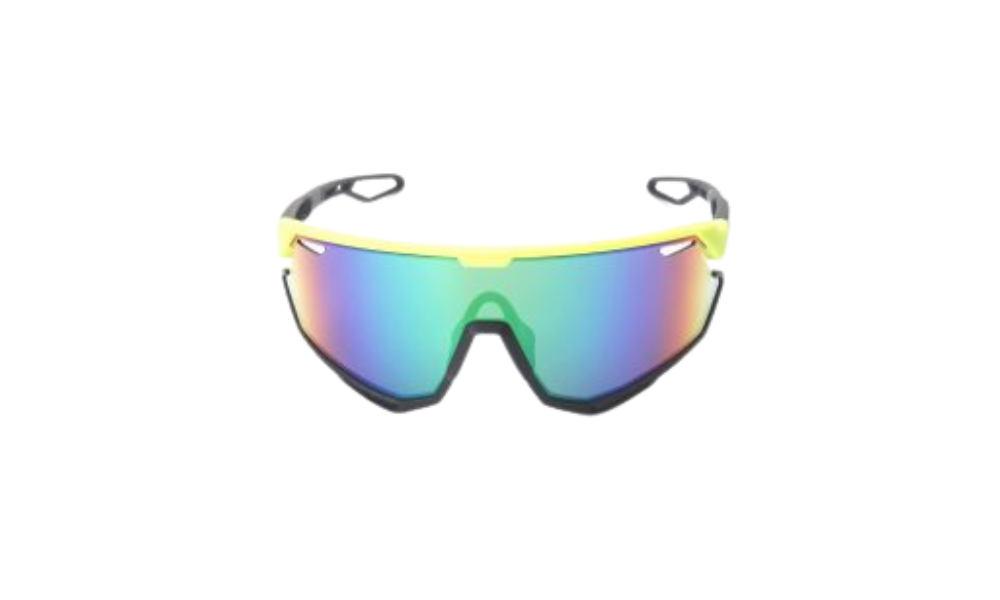 Sunglasses for Cycling. Yellow and black frames and multicolored lenses. State-of-the-art sunglasses.